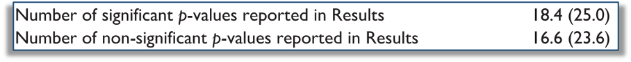 But this paper received some publicity because of a new exploratory metric ‘p-values per study participant’. On average, there were 0.77 p-values reported for every study participant (SD = 1.35). The range was 0.02 (i.e., one p-value to every 50 participants) to 11.44 (i.e., more than 11 p-values to each participant!):